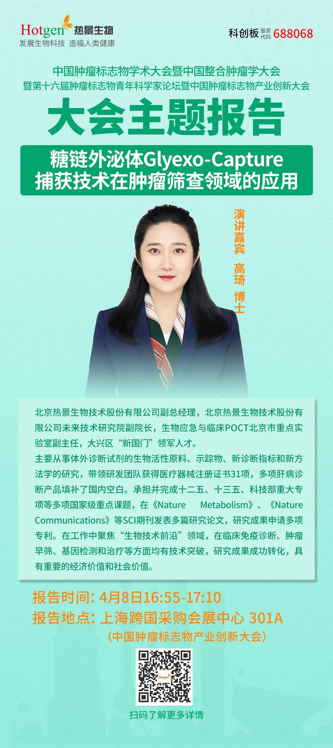 4月8日下午,北京熱景生物技術(shù)股份有限公司副總經(jīng)理,北京熱景生物未來技術(shù)研究院副院長高琦博士受邀在中國腫瘤標(biāo)志物產(chǎn)業(yè)創(chuàng)新大會(huì)分享創(chuàng)新技術(shù)報(bào)告《糖鏈外泌體Glyexo-Capture捕獲技術(shù)在腫瘤篩查領(lǐng)域的應(yīng)用》。