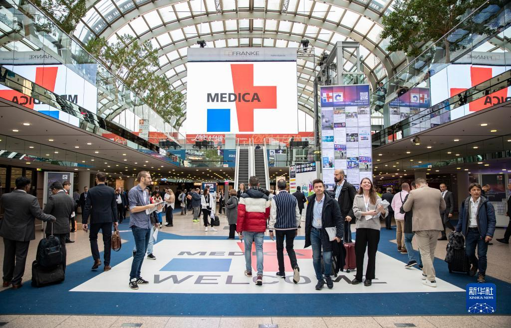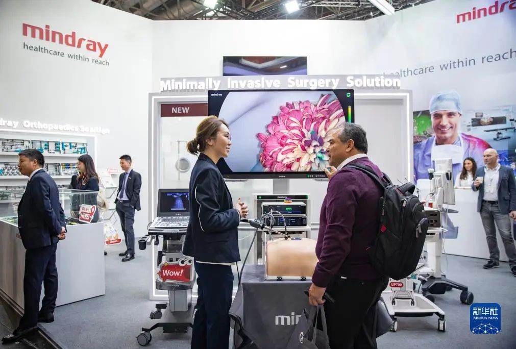 11月13日,在德國杜塞爾多夫國際醫(yī)療器械設(shè)備展,參觀者在邁瑞醫(yī)療展位咨詢洽談。新華社記者 張帆 攝