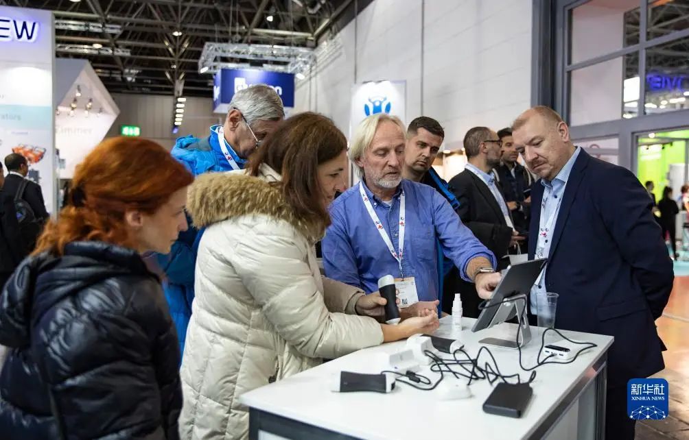 11月13日,在德國杜塞爾多夫國際醫(yī)療器械設(shè)備展,參觀者在熱景生物展位咨詢洽談。新華社記者 張帆 攝