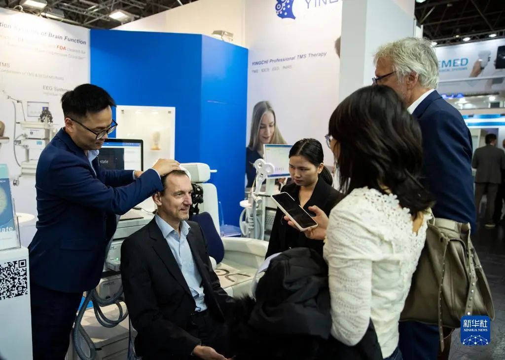 11月13日,在德國杜塞爾多夫國際醫(yī)療器械設(shè)備展,參觀者在英智醫(yī)療展位體驗經(jīng)顱磁刺激儀。新華社記者 張帆 攝