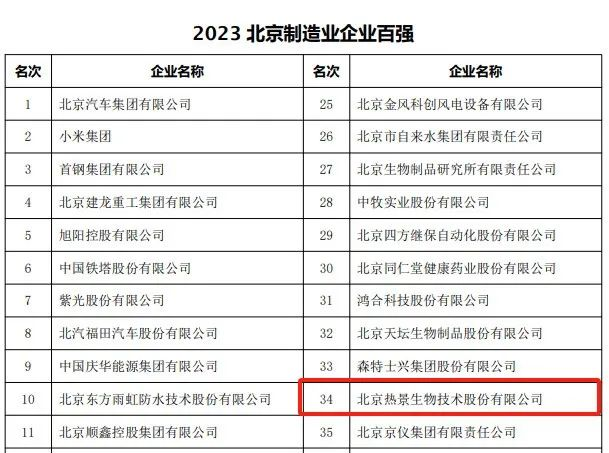 近日,北京企業(yè)聯(lián)合會(huì)、北京市企業(yè)家協(xié)會(huì)公布了2023北京企業(yè)百強(qiáng)名單,熱景生物榮登熱景生物榮登2023北京高精尖企業(yè)百強(qiáng)、2023北京制造業(yè)企業(yè)百強(qiáng)、2023北京服務(wù)業(yè)企業(yè)百強(qiáng)三大榜單!三大榜單!