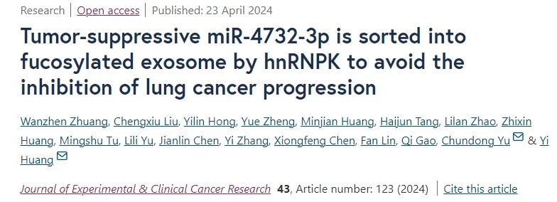 4月23日,福建醫(yī)科大學(xué)研究團(tuán)隊(duì)在期刊《Journal of Experimental & Clinical Cancer Research》上發(fā)表了題為“Tumor-suppressive miR-4732-3p is sorted into fucosylated exosome by hnRNPK to avoid the inhibition of lung cancer progression”的研究論文,本研究為非小細(xì)胞肺癌提供了一個(gè)有前景的生物標(biāo)志物,并通過(guò)靶向hnRNPK阻止miR-4732-3p從非小細(xì)胞肺癌細(xì)胞中“外泌體逃逸”,為非小細(xì)胞肺癌治療開(kāi)辟了一條新的途徑。文章共同作者包括北京熱景生物技術(shù)股份有限公司高琦博士、劉城秀博士,熱景生物作為合作單位為研究的實(shí)施提供了重要支持。