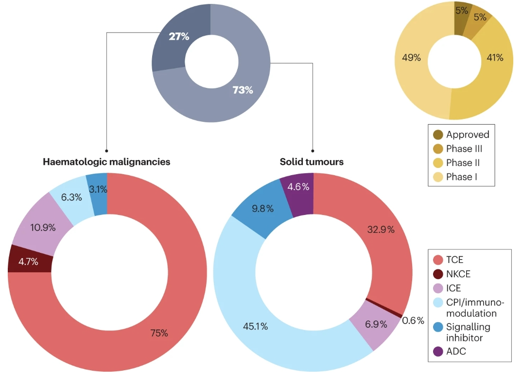 目前,有300多項臨床試驗涉及200多種不同的雙特異性抗體分子,其中約75%用于治療實體瘤,25%用于治療血液系統(tǒng)惡性腫瘤。有10種bsAb藥物已被批準用于癌癥治療,其中9種在美國和/或歐洲獲得批準,cadonilimab在中國獲得批準。到目前為止,臨床中開發(fā)的很大一部分bsAbs已經處于后期階段(II期和III期)。另外,可以發(fā)現(xiàn),治療實體瘤的bsAbs主要由免疫調節(jié)劑主導,包括雙CPI(約45%)和TCE(約33%),其次是靶向雙途徑、ICEs和ADC的bsAb。