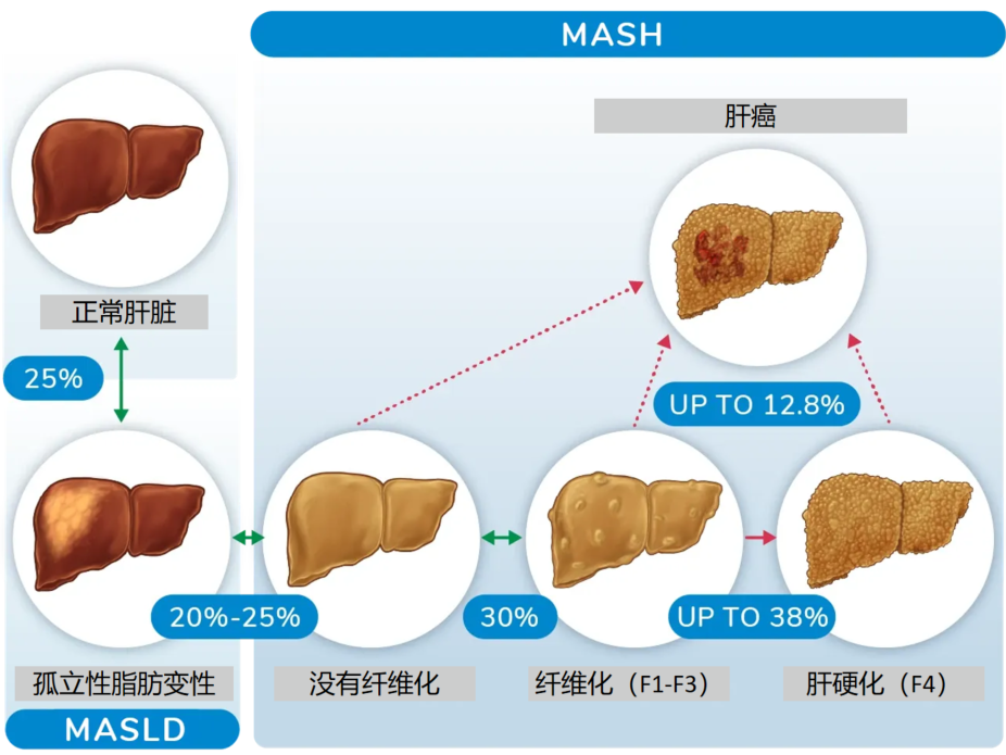 MASLD疾病譜包括單純性脂肪肝(MAFL)、脂肪性肝炎(MASH)及其相關(guān)纖維化和肝硬化。隨著肥胖和2型糖尿?。═2DM)的流行,全球MASLD患病率和發(fā)病率不斷增高。據(jù)報(bào)道,全球MASLD的發(fā)病率約20-35%,其中約10-30%的患者患有MASH。