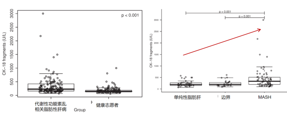 與健康人相比,MASLD患者血清CK18含量顯著升高;與單純性脂肪變性和邊緣診斷患者相比,MASH患者血清CK18含量顯著升高。MASH患者血液中CK-18片段顯著增加,CK18是MASH的獨(dú)立預(yù)測(cè)因子[1]。
