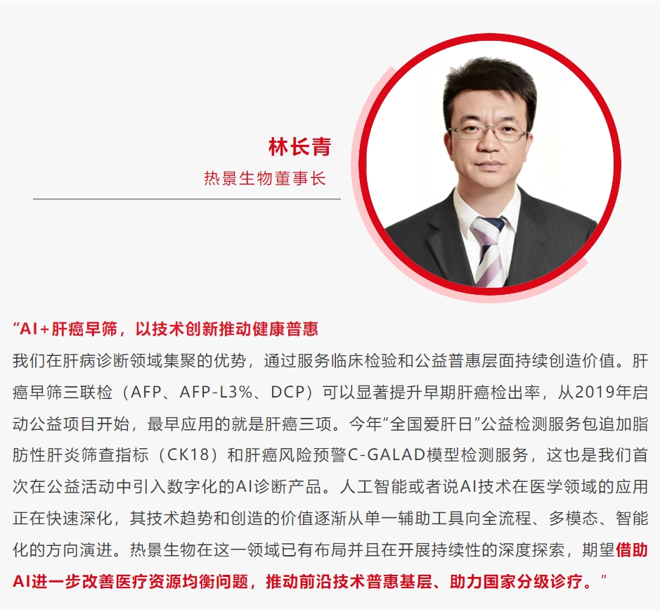 3月18日,值第25個“全國愛肝日”期間,“2025肝癌防治健康中國行——全國愛肝日”大型公益義診活動在全國30省份近百家醫(yī)院的協(xié)同下聯(lián)合展開,惠及近萬人次,公益健康服務(wù)包(肝癌三項、GP73、CK18-M30/M65等)由熱景生物支持。2025年升級版“肝病全周期健康檢測服務(wù)包”首次融合數(shù)智化AI診斷模型,探索“AI+創(chuàng)新診療”公益新模式,通過智能算法提升肝癌篩查效益,助力實現(xiàn)"篩查-診斷-干預(yù)"全流程精準管理,全面推動肝癌防治邁入數(shù)智化新階段。