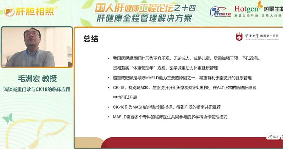 寧波大學(xué)附屬第一醫(yī)院內(nèi)分泌科毛洲宏教授在會(huì)議上圍繞“減重門診與CK18的臨床應(yīng)用”作專題報(bào)告,強(qiáng)調(diào)國(guó)家衛(wèi)健委“體重管理年”政策推動(dòng)下,醫(yī)療機(jī)構(gòu)需加強(qiáng)減重門診建設(shè),為超重及肥胖人群提供專業(yè)化服務(wù)。毛教授也以本院“肥胖俱樂(lè)部”在開(kāi)設(shè)近十年的真實(shí)經(jīng)驗(yàn),給我們科普了減重管理的重要性。目前,我國(guó)超重肥胖形勢(shì)嚴(yán)峻,超50%成人存在體重異常,肥胖與代謝相關(guān)脂肪性肝病(MAFLD)密切相關(guān),約20% MAFLD患者可能進(jìn)展為脂肪性肝炎(MASH),T2DM患者合并MAFLD比例高達(dá)65.04%。毛教授指出,傳統(tǒng)檢測(cè)手段如ALT、B超在早期診斷MASH及纖維化中存在局限性,而細(xì)胞角蛋白18(CK-18)片段作為新型生物標(biāo)志物,通過(guò)M30/M65片段可無(wú)創(chuàng)評(píng)估肝細(xì)胞凋亡與壞死,其敏感性與特異性顯著優(yōu)于傳統(tǒng)指標(biāo)。此外,MAFLD需多學(xué)科協(xié)作管理,結(jié)合減重、改善代謝、抗纖維化等綜合干預(yù)措施,定期監(jiān)測(cè)高危人群。毛教授總結(jié)稱,CK18的應(yīng)用將推動(dòng)MAFLD精準(zhǔn)診療,而政策支持與多學(xué)科模式普及,為肥胖及相關(guān)代謝疾病防控注入新動(dòng)力。