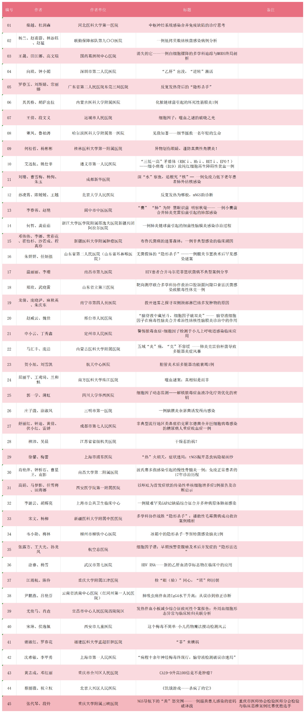 為了有效推動(dòng)檢驗(yàn)與臨床的深度融合,進(jìn)一步提升檢驗(yàn)人員的臨床思維能力,在中華醫(yī)學(xué)會(huì)檢驗(yàn)醫(yī)學(xué)分會(huì)青年學(xué)組指導(dǎo)下,西部數(shù)智醫(yī)療研究院、《檢驗(yàn)醫(yī)學(xué)》雜志、檢驗(yàn)醫(yī)學(xué)新媒體主辦,白求恩精神研究會(huì)檢驗(yàn)醫(yī)學(xué)分會(huì)細(xì)胞因子與疾病檢測(cè)學(xué)組、北京熱景生物技術(shù)股份有限公司協(xié)辦的「第五屆檢驗(yàn)與臨床(感染性疾病)思維案例展示活動(dòng)」已全面啟動(dòng)。在面向全國(guó)進(jìn)行征稿,并對(duì)稿件進(jìn)行雙盲雙審(同一篇稿件均由2位專(zhuān)家進(jìn)行評(píng)審)后,根據(jù)評(píng)審結(jié)果,共納入復(fù)審稿件45篇。以下為詳細(xì)名單,排名不分先后。
