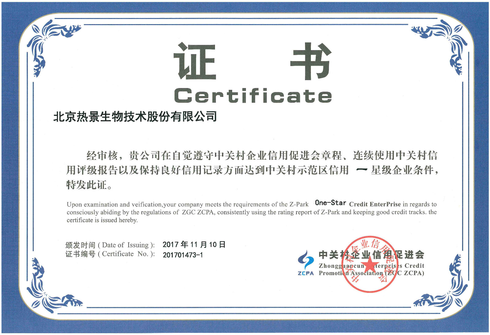 中關(guān)村信用促進(jìn)會(huì)信用星級(jí)評(píng)定證書一星級(jí)